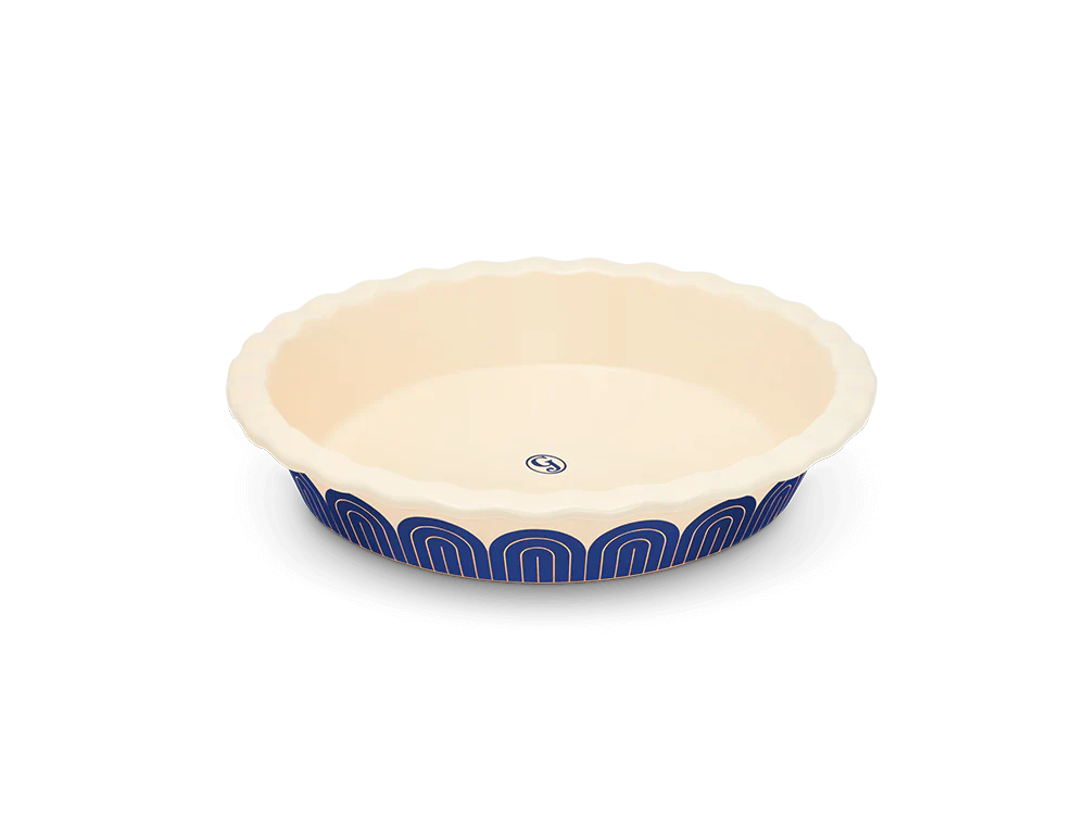 This vibrant ceramic dish is designed for baking and serving pies, quiches, or savory tarts directly at the table. It matters in this context because its wavy edges and bold colors eliminate the need for decorative platters.