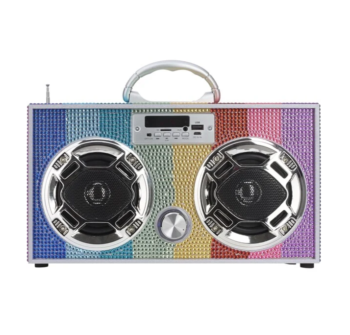 This Bluetooth Mini Boombox - Rainbow Bling is a portable speaker that lets you easily stream music throughout the night. Its colorful, fun design adds a playful element to your setup, while its Bluetooth capabilities make it a hassle-free way to play a pre-made playlist. This speaker is great for setting the vibe with minimal effort, and its compact size makes it perfect for any space.